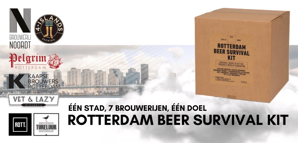 ‘De Rotterdam Beer Survival Kit krijgt het symbolische bedrag van € 20,20. Een deel hiervan gaat naar de detailhandel. Wat nog overblijft na kostprijs, verpakking etc., wordt verdeeld onder de brouwerijen. We hopen vooral ook dat er op deze manier geen voorraad verloren gaat.